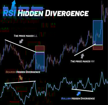 La divergence cachée est un concept utilisé en analyse technique, qui se produit lorsque les prix d'un actif atteignent de nouveaux sommets ou creux, mais que les indicateurs de momentum (comme le RSI ou le MACD) ne confirment pas ces mouvements. Cela peut indiquer que la tendance actuelle est plus forte qu'elle ne le semble, suggérant une continuation de la tendance existante plutôt qu'un renversement.