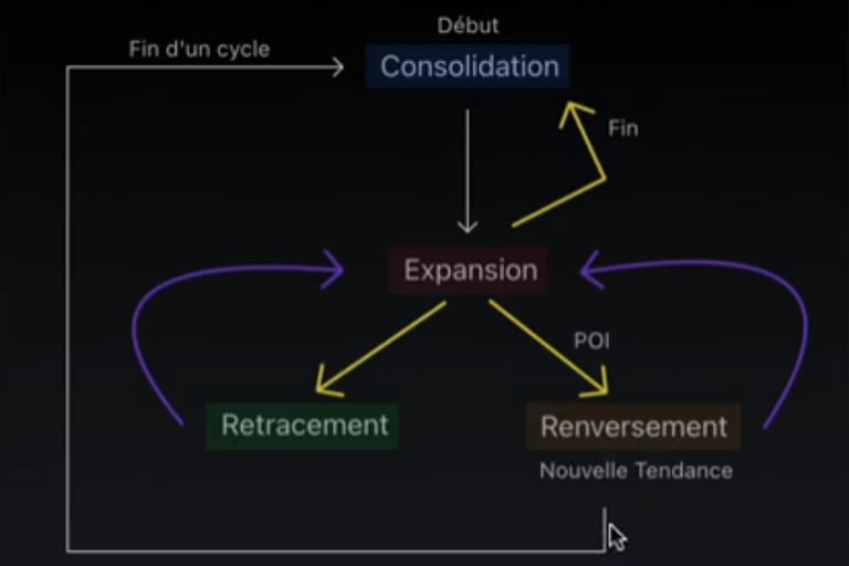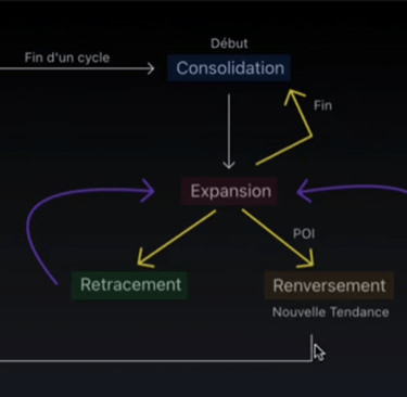 Apres. vous pouvez anticiper soit une nouvelle Consolidationpour un nouveau cycle, soit un Retracement pour continuer l'Expension, soit un reversal indiquant un changement de tendance.