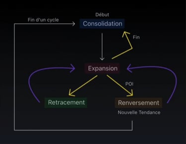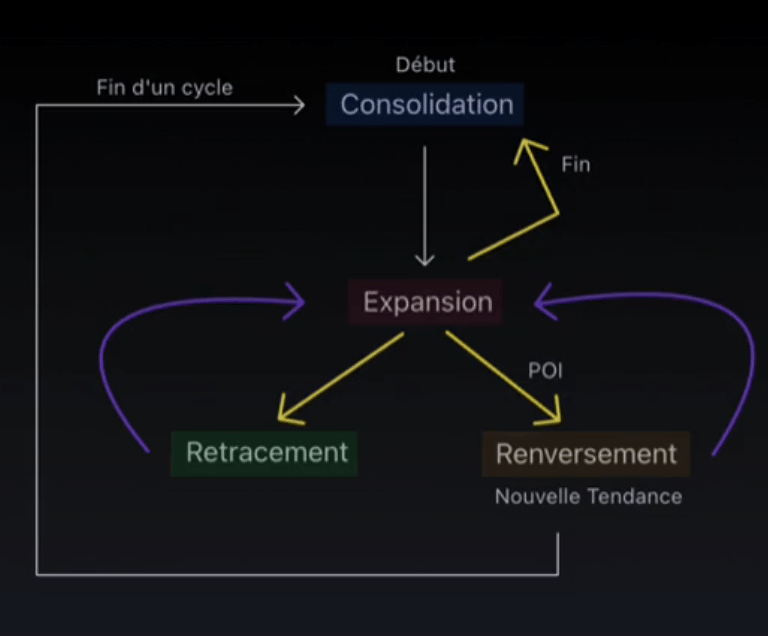 L'expansion désigne une phase durant laquelle le prix montre une direction claire, caractérisée par des mouvements rapides et dédiés, souvent visibles à travers des bougies impulsives.